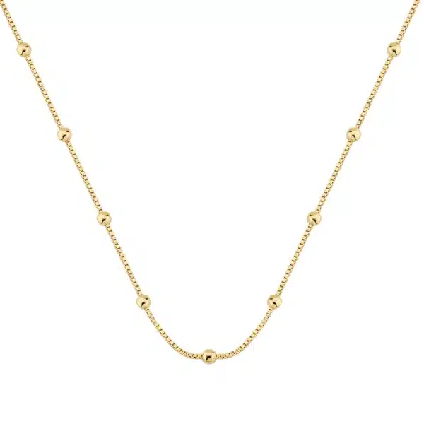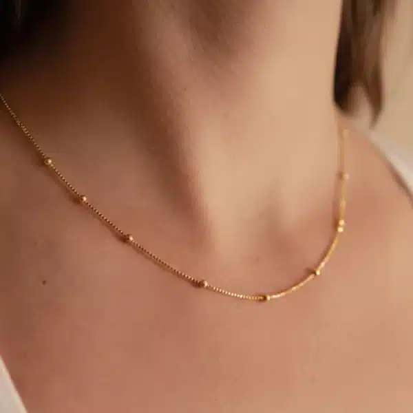 O Colar Luz possui corrente delicada com esferas douradas distribuídas de forma uniforme, criando pontos de brilho sutis ao longo do colo.