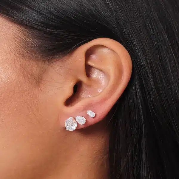 O Trio Reluz reúne três tamanhos de brilho em uma única proposta. Cada par, em lapidação gota, reflete a luz de um jeito diferente, da delicada cintilância do menor ao brilho marcante do maior. Versátil e delicado, o Trio permite combinações infinitas: usar sozinho, misturar tamanhos ou criar composições que iluminam o contorno da orelha com naturalidade.